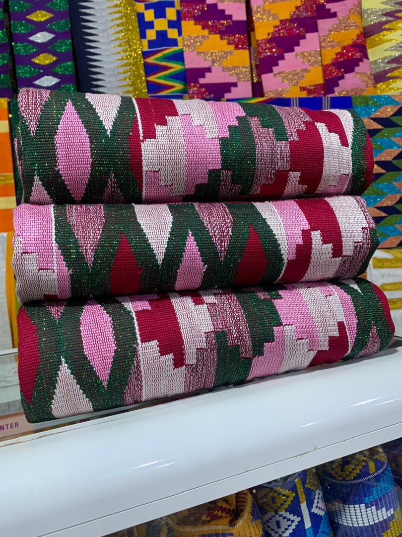 Make a bold and beautiful statement with the Blush Flame Kente, a stunning blend of rose pink, deep burgundy, emerald green, and metallic shimmer. This striking pattern symbolizes passion, feminine resilience, and inner fire—ideal for ceremonies, bridal wear, fashion design, or artistic styling.